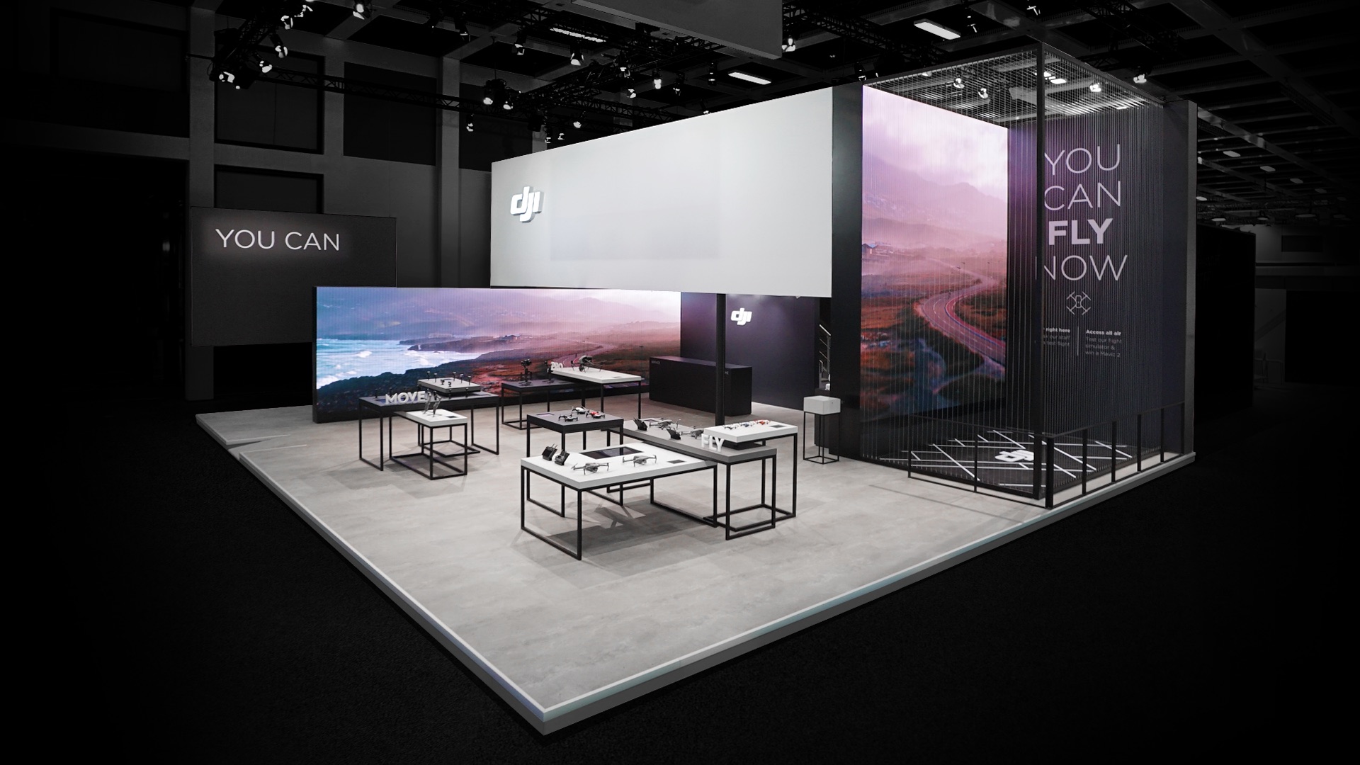 Für die Kommunikation der Marken-DNA sorgen zwei hochauflösende LED Screens mit einem synchronisierten Content-Mix aus DJI-Footage und dynamisch inszenierter Kampagnenbotschaft „YOU CAN“. Ein horizontaler Screen rahmt die Ausstellungstische mit atemberaubendem Footage und sorgt so für ein Gefühl von endloser Freiheit. Ein vertikaler Screen öffnet die Bühne für hautnahe Produktshows im neu konzipierten „Flightcage“. Gemeinsam geben sie den kommunikativen Rahmen vor und erwecken den Stand zum Leben.