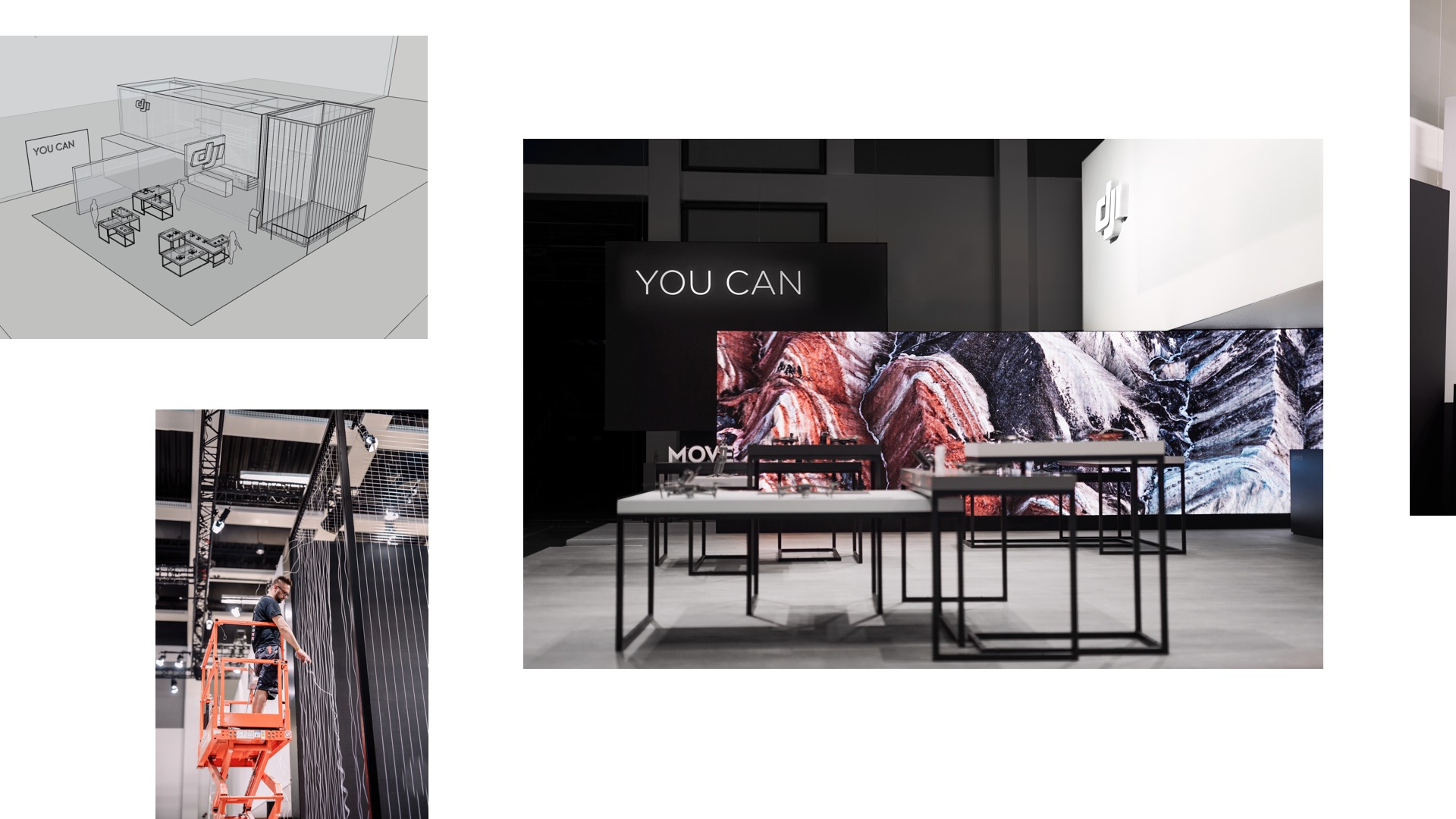 Die breite Vielfalt an atemberaubendem DJI-Footage diente als visuelle Basis, um die drei Produktwelten emotional zu etablieren. Formatfüllende kinetische Typografieelemente sorgte für die Kommunikation des Leitgedanken „YOU CAN“ und schafften Kontext zu den Produktkategorien. Das Resultat ist ein Visual Branding, das Raum, Produkte und Besucher ganzheitlich im Kontext des Markenversprechens „YOU CAN“ verbindet und den Hero-Produkten jeder Kategorie eine eindrucksvolle, vollsynchrone Bühne bietet, die weit über den Stand hinaus kommuniziert.